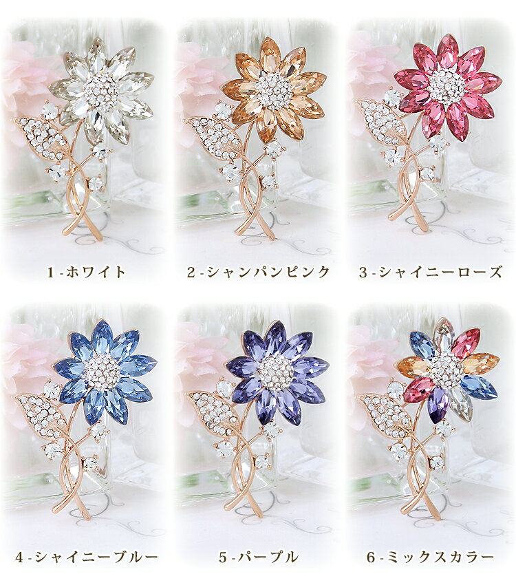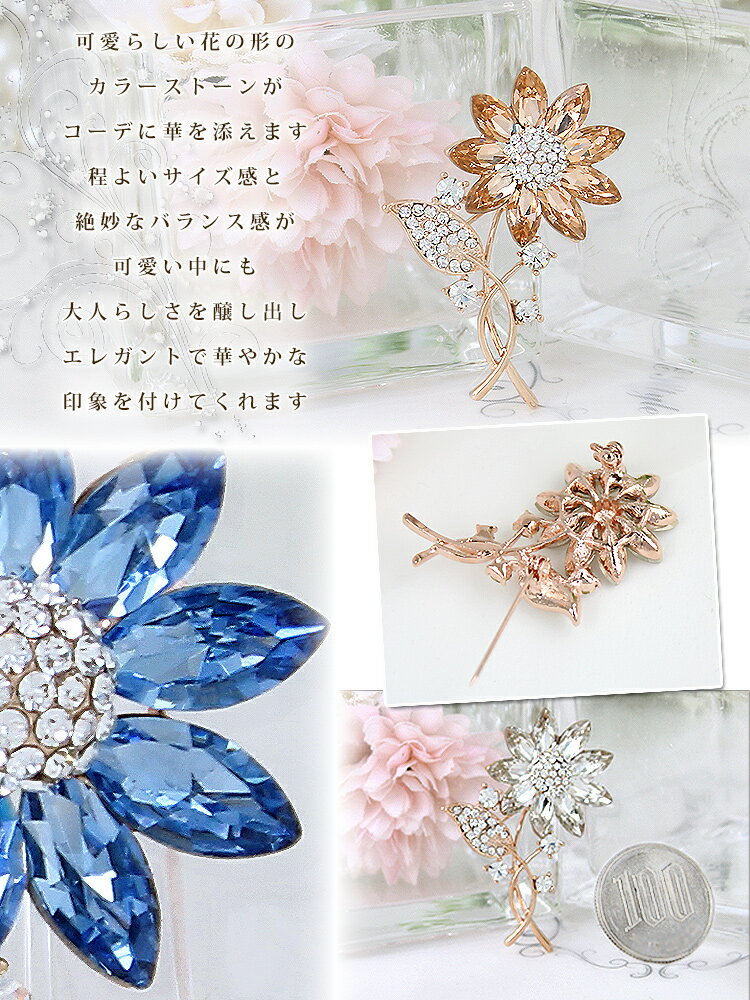 送料無料! 可愛らしい花の形のカラーストーンが コーデに華を添えます 程よいサイズ感と絶妙なバランス感が 可愛い中にも大人らしさを醸し出し エレガントで華やかな印象を付けてくれます サイズ約4.7cm×3.3cm 素材合金 生産国Made in China 備考※コチラの商品はゆうパケット限定送料無料となります。